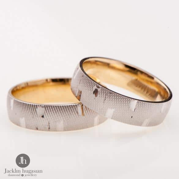 Венчални халки от "Jacklin hugasian " в бяло и жълто злато с лазерна шлифовка, олекотени. Фабрична изработка.