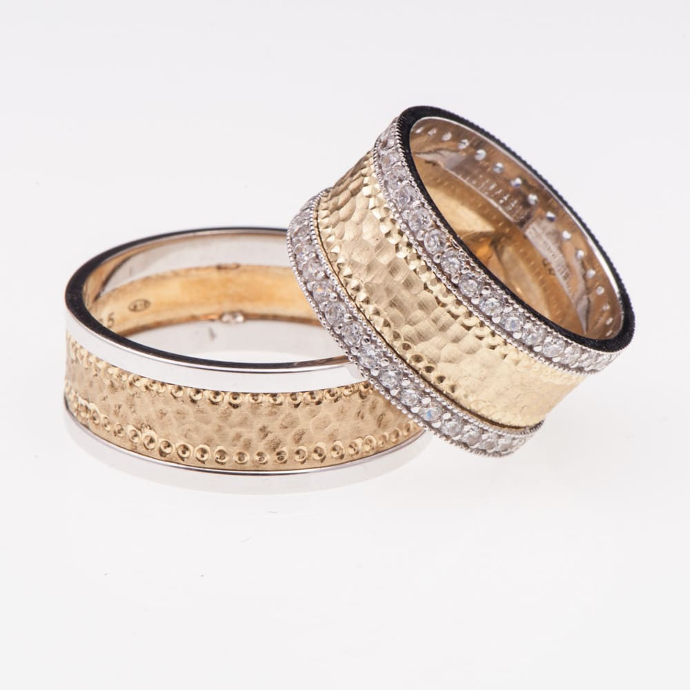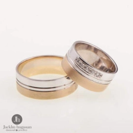 Венчални халки от "Jacklin hugasian " в бяло и жълто злато мат и гланц с шлифовка. Фабрична изработка.