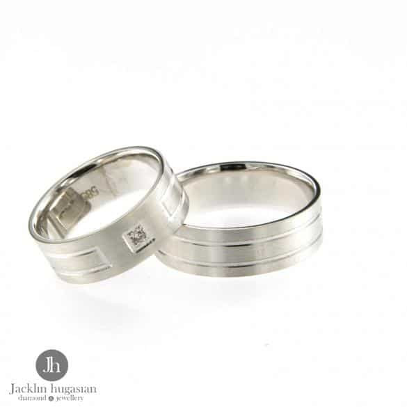 Венчални халки от "Jacklin hugasian" в бяло злато мат и гланц с циркон.