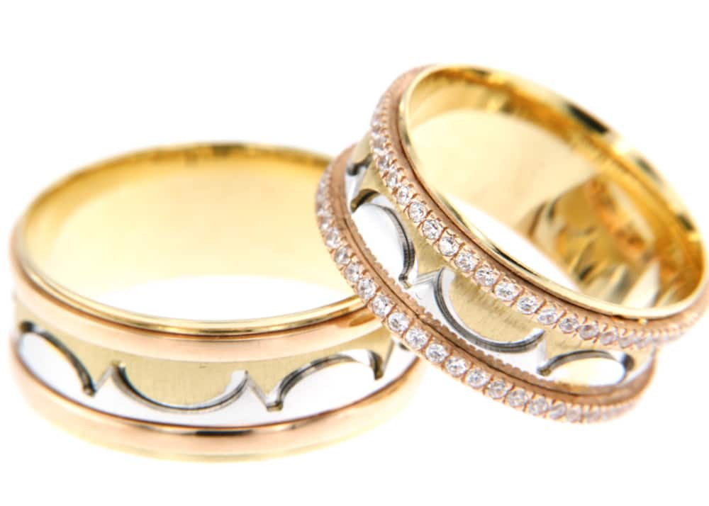 Венчални халки от " Jacklin hugasian " в бяло,жълто и розово злато, мат и гланц с цирконий.