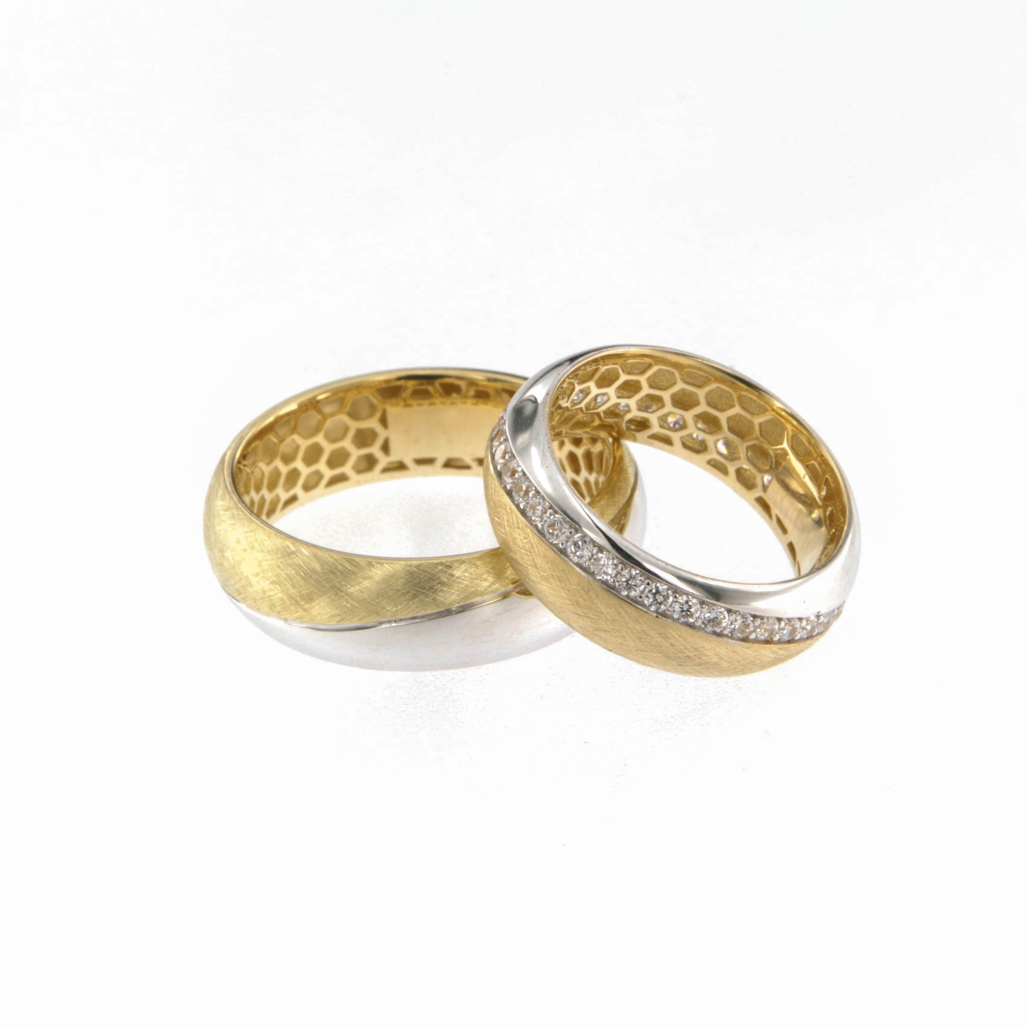 Венчални халки от "Jacklin hugasian" в жълто и бяло злато, сатениран мат и гланц с цирконии, олекотени. Фабрична изработка.