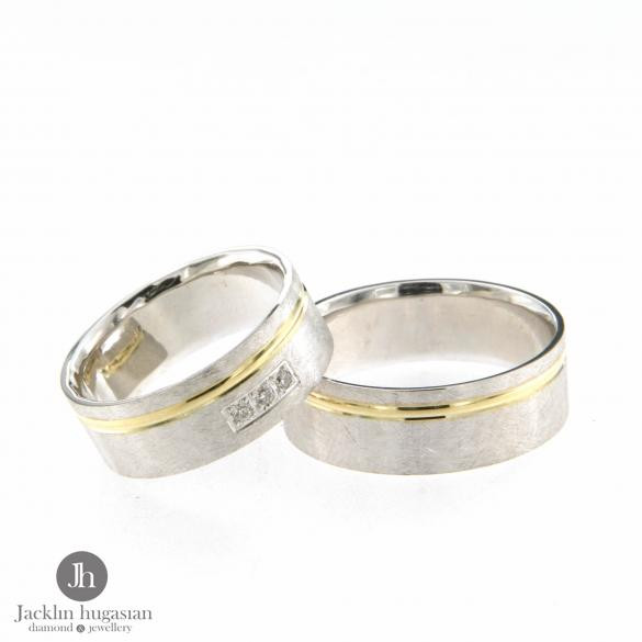 Венчални халки от "Jacklin hugasian " в жълто злато и бял сатениран мат .