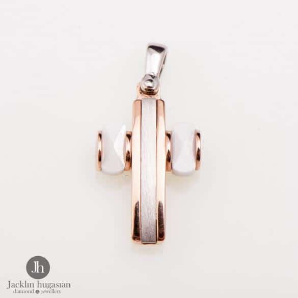 Висулка от "Jacklin hugasian" в матирано бяло и розово злато гланц с ахат.