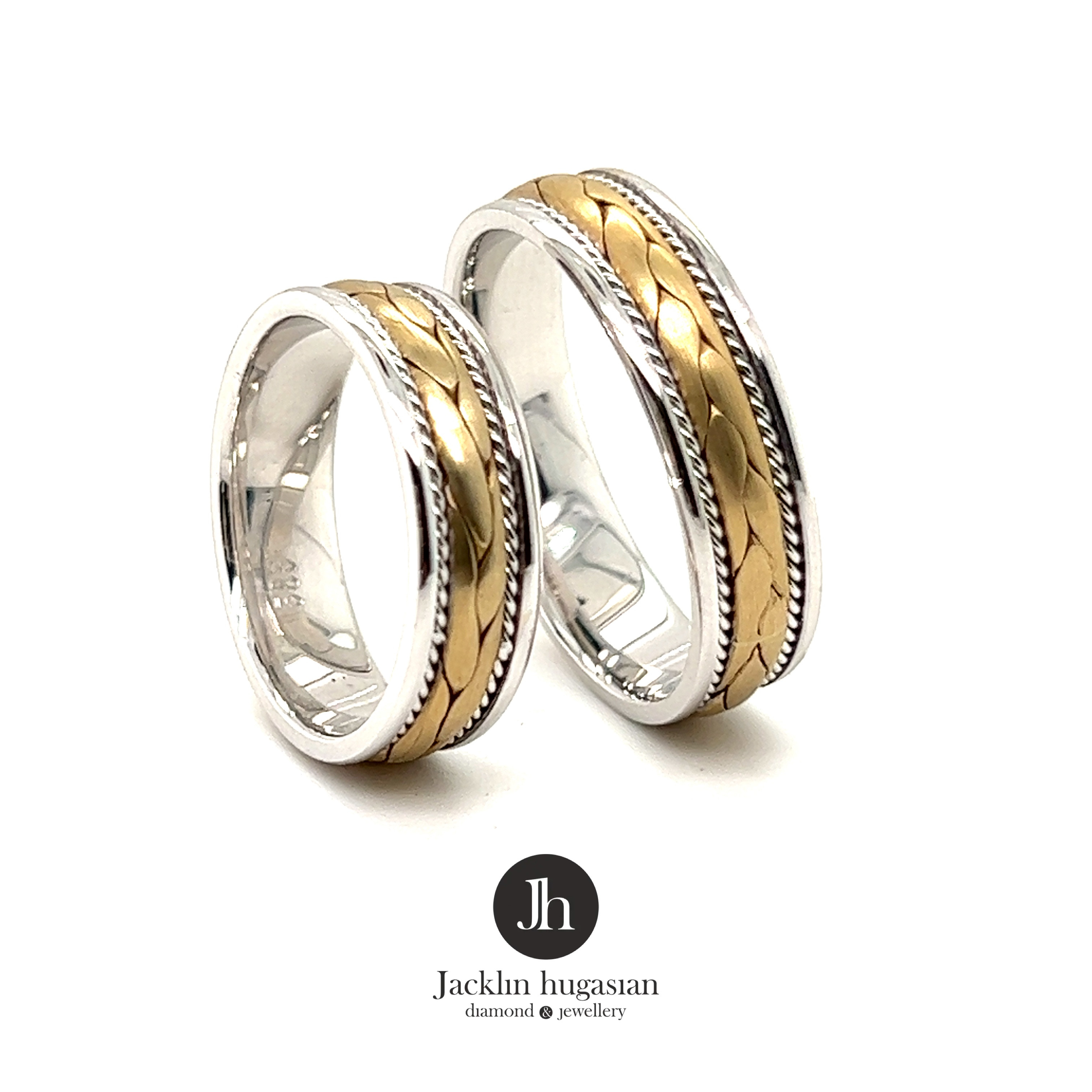 Венчални халки от "Jacklin hugasian" в жълто и бяло злато мат и гланц с цирконии.